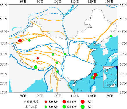 本月(2025年12月)全國(guó)發(fā)生5級(jí)以上地震5次(圖2,表1),臺(tái)灣地區(qū)5級(jí)以上地震3次,最大為臺(tái)灣宜蘭縣海域(北緯24.67度,東經(jīng)122.06度)6.6級(jí)地震。本月全國(guó)地震活動(dòng)水平較上月增強(qiáng)(上月全國(guó)未發(fā)生5級(jí)以上地震)。